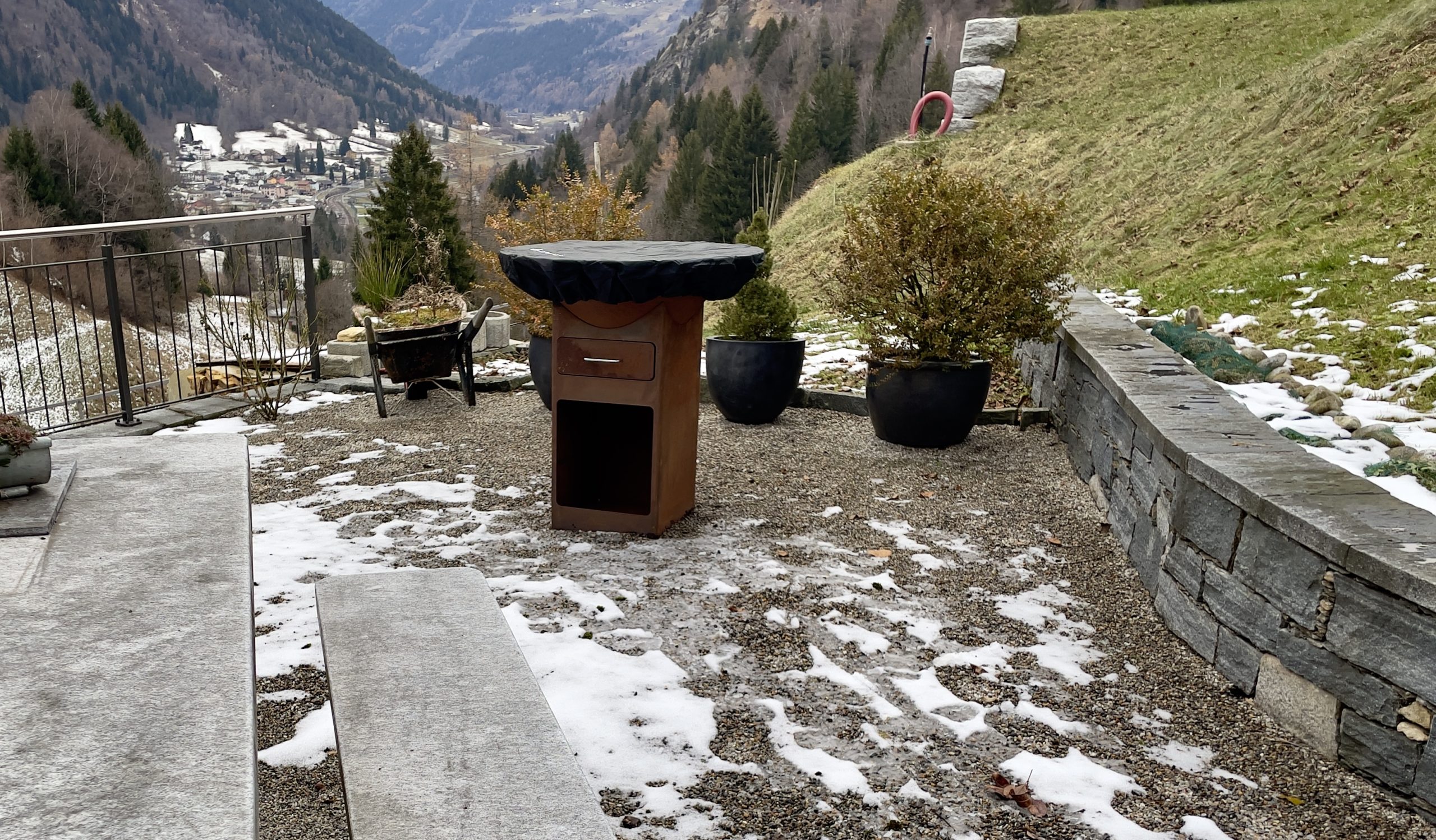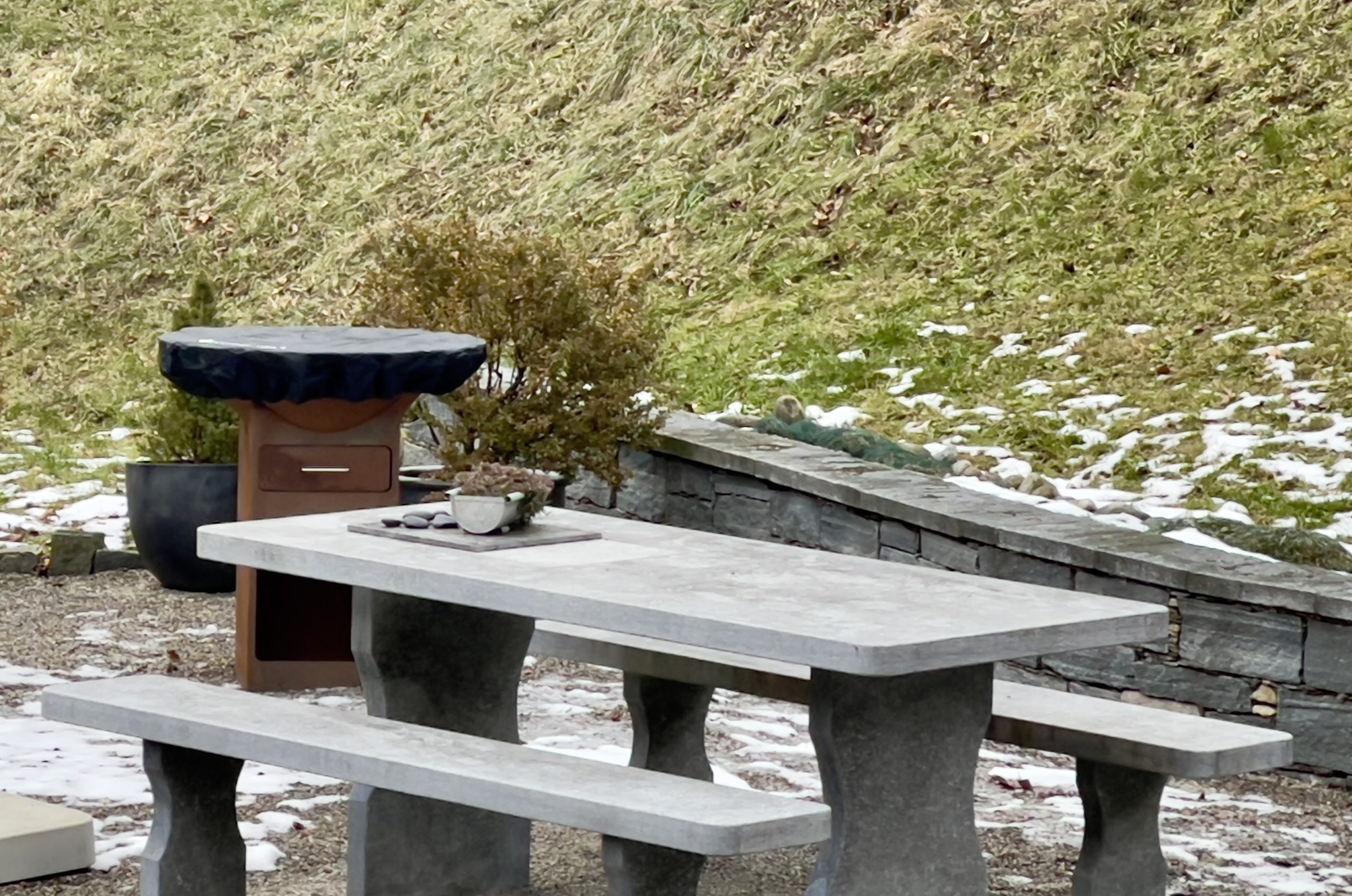 - A large gravel terrace with a granite table and a breathtaking view of the valley